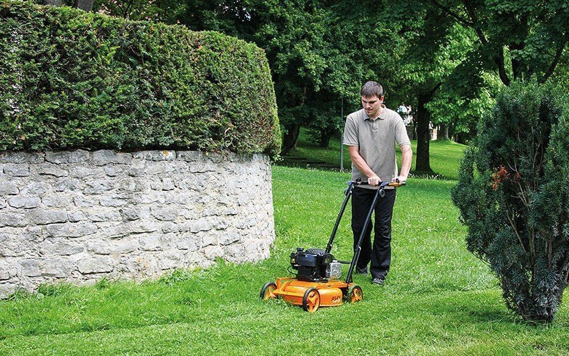Die doppelt kugelgelagerten Spezialräder sorgen für ein leichtgängiges schieben des Mulchmähers und ein einfaches Handling. Zusätzlich teilen die Vorderräder durch ihre spezielle Keilform das Gras und drücken extrem wenig Gras vor dem Mähwerk nach unten. Das Ergebnis ist ein perfektes Schnittbild ohne Radspuren. Durch die federunterstützte, zentrale Schnitthöheneinstellung lassen sich die 5 Schnitthöhen von 40 – 80 mm sowohl per Fuß als auch per Hand mühelos einstellen.