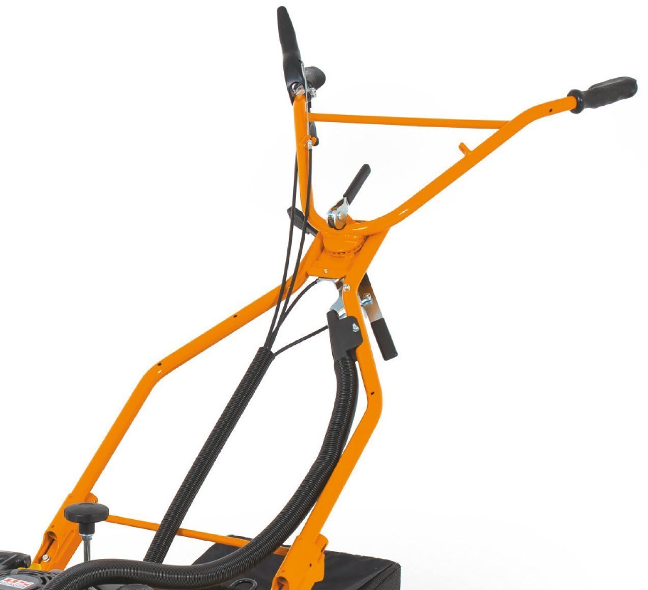 Der Seitenprallschutz lässt sich aus der Position des Bedieners per Hebel um 180° öffnen. Die Bürsten laufen dann seitlich offen. Für Arbeiten an Bordsteinen oder bei seitlich verstelltem Holm an Mauer- und Hallenwänden.