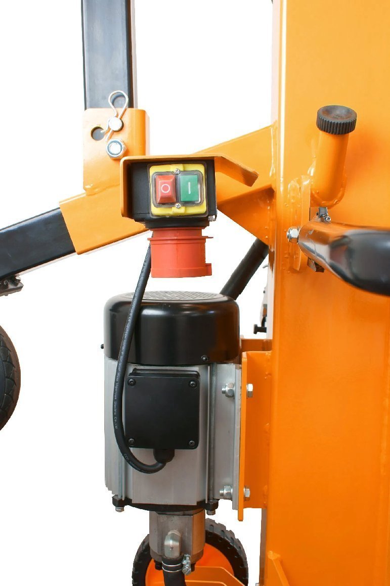 Durch das Fahrwerk und den Transportgriff ist der Brennholzspalter trotz der Größe und des Gewichtes einfach umzusetzen.