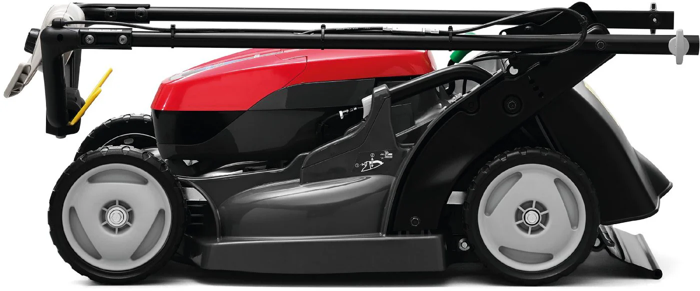 Dank des klappbaren Führungsholm kann der Rasenmäher platzsparend eingelagert oder transportiert werden.