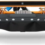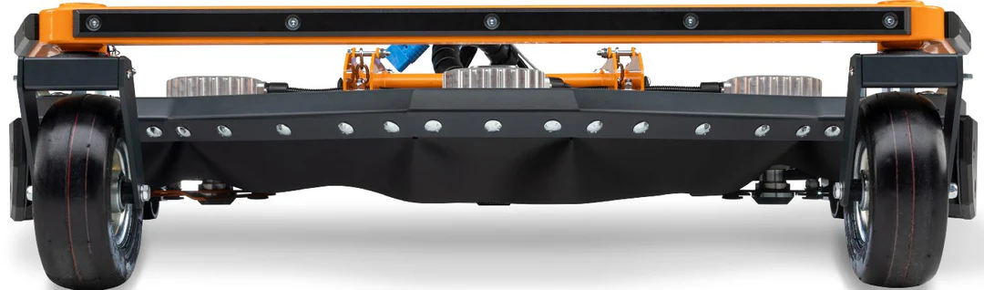 Die Schnitthöhe ist flexibel zwischen 60 und 140 mm einstellbar – mit vibrationssicheren Sicherungsstiften, die auch bei starken Erschütterungen an Ort und Stelle bleiben. Dank des robusten Stahlrahmens und widerstandsfähigen Nylonstoßfängern ist das Mähwerk optimal gegen Kontakt mit festen Hindernissen, wie beispielsweise den Trägerstrukturen von Photovoltaik-Anlagen, geschützt. Die speziellen Schwingmesser mit Heckauswurffunktion ermöglichen einen effizienten und schnellen Schnitt selbst bei besonders dichtem oder hohem Gras. Für zusätzlichen Komfort sorgen die gefederten Schwenkräder, die Vibrationen auf unebenem Terrain zuverlässig dämpfen.