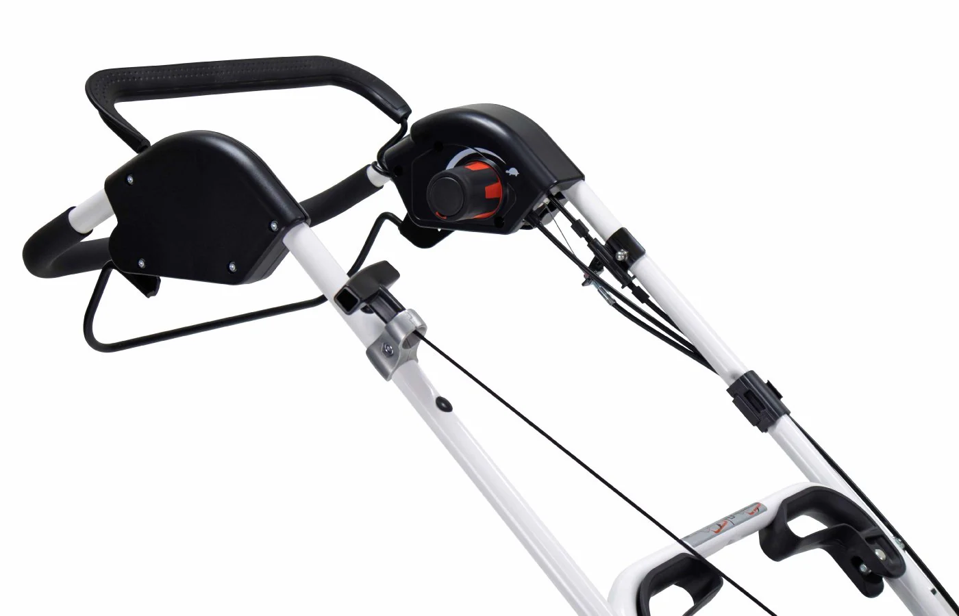 der zweifach klappbare Holm ermöglicht eine besonders platzsparende Lagerung des Rasenmähers