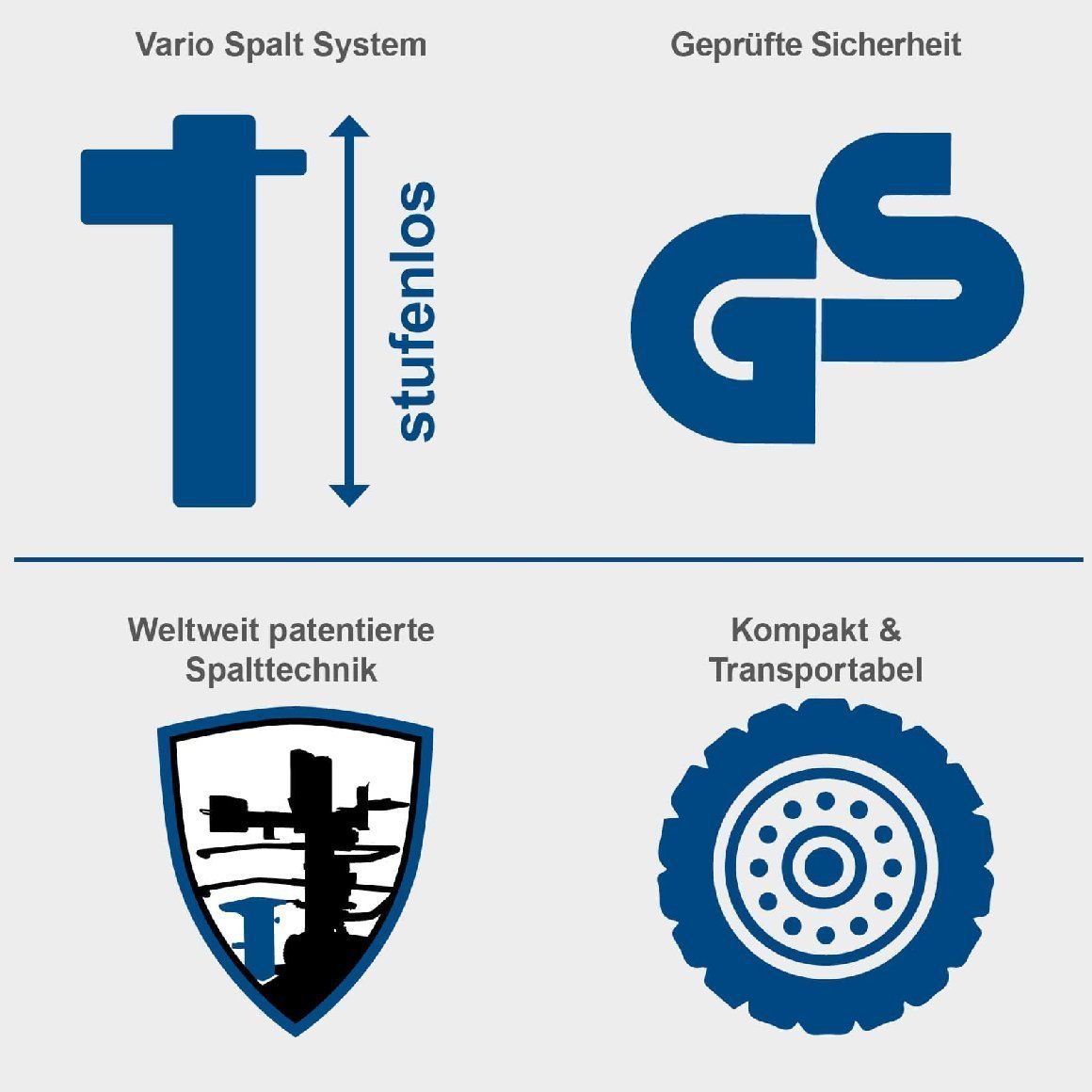 Patentierte Spalttechnik – einziger Spalter Europas in der 15 T Klasse der Spaltgut in verschiedenen Arbeitshöhen spalten kann