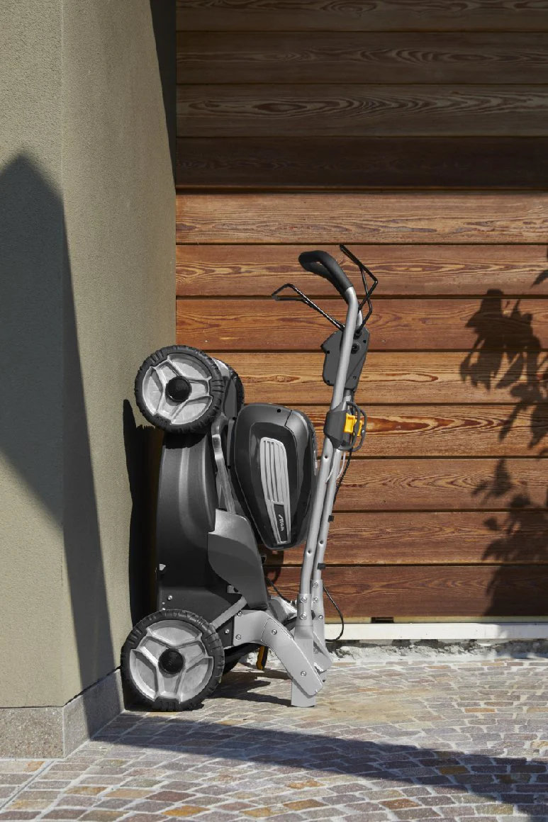 Dank des klappbaren Führungsholm kann der Rasenmäher platzsparend eingelagert oder transportiert werden.