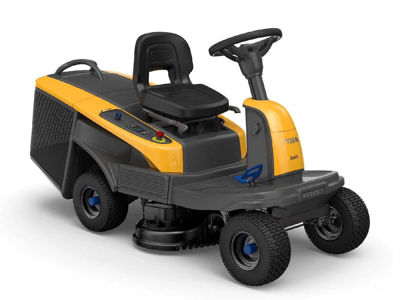 Ergonomischer Komfort: Der komfortable, verstellbare Sitz sorgt auch bei längeren Mähzeiten für eine bequeme Fahrt. Das stufenlos einstellbare Lenkrad ermöglicht eine anpassbare Fahrposition, und das lenkbare Vorderrad sorgt für exzellente Wendigkeit und einfache Manövrierbarkeit – selbst in engen Bereichen und rund um Hindernisse.
