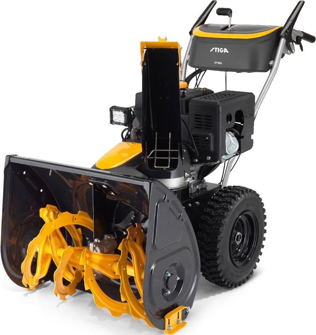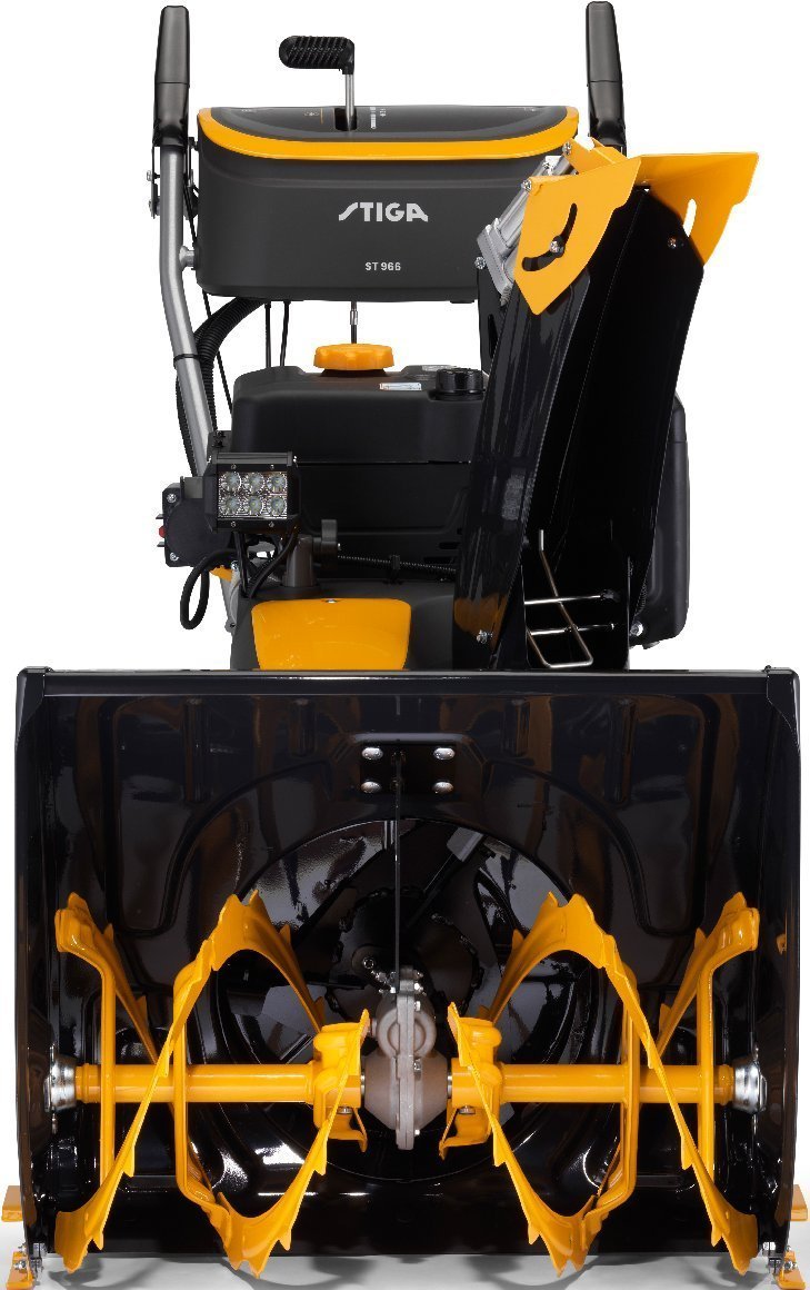 STIGA ST 966 wurde entwickelt, um selbst die anspruchsvollsten Schneeansammlungen zu beseitigen, und ist eine zweistufige Schneefräse mit einer Arbeitsbreite von 66 cm und 16 Zoll großen Snow-Hog-Rädern. Das hydrostatische Getriebe bietet zusätzlichen Komfort mit vibrationsfreien und hochwertigen Funktionen. Das Gerät wird angetrieben vom STIGA WS 300 Benzinmotor mit 302 cm³ und du kannst es elektrisch bei jeder Temperatur bis zu -30 °C starten. Dank der Griffheizung, die über eine Taste am Armaturenbrett aktiviert wird, kannst du mit dem ST 966 auch bei sehr niedrigen Umgebungstemperaturen kontinuierlich arbeiten. Alle Befehle sind elektrisch und werden am Bedienfeld platziert, was die Benutzererfahrung verbessert. Dank eines neuen Lüfterrads mit drei Propellerflügeln kann Schnee bis zu 15 Meter ausgeworfen werden. Bei schlechten Lichtverhältnissen gewährleisten die verstellbaren LED-Scheinwerfer eine umfassende Sicht.