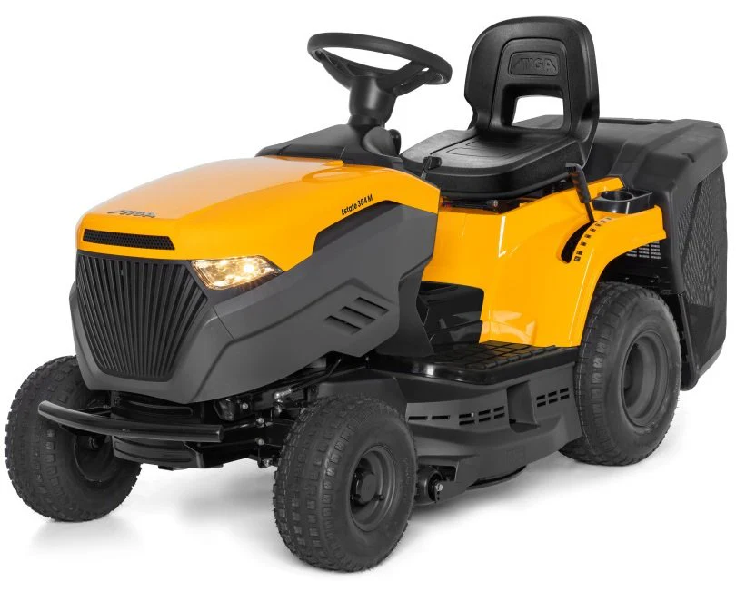 Der Rasentraktor STIGA Estate 384 M ist ausgestattet mit einem ST 400 Powered by STIGA Benzinmotor mit einer Nennleistung von 5,8 kW bei 2400 U/min. Dieser Gartentraktor verfügt über ein Schaltgetriebe mit 5 Vorwärtsgängen und 1 Rückwärtsgang, einen 200 Liter Heckfangkorb und ein erhöhtes ergonomisches Lenkrad für komfortables Fahren. Bei dem 84 cm breiten Mähdeck mit zwei Messern lassen sich 7 verschiedene Schnitthöhen zwischen 25 und 80 mm auswählen. Die praktische elektromagnetische Messerkupplung wird per Tastendruck gesteuert. Der Estate 384 M kann mit dem separat erhältlichen STIGA Multiclip-Dübel auch zum Mulchen von Grasschnitt verwendet werden. Mulchkit und Batterieladegerät separat erhältlich