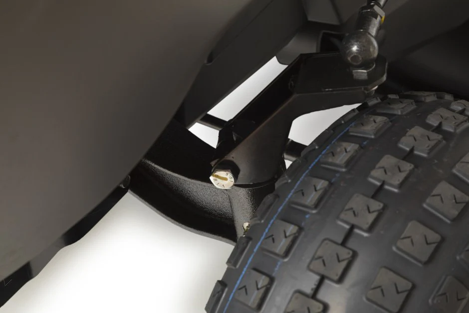 Die pendelnde Vorderachse hält unabhängig vom starren Rahmen der Maschine durchgängig Bodenkontakt. Das Mähwerk folgt dieser Bewegung, so dass das Schnittbild auch bei leichten Unebenheiten gleichmäßig ist.