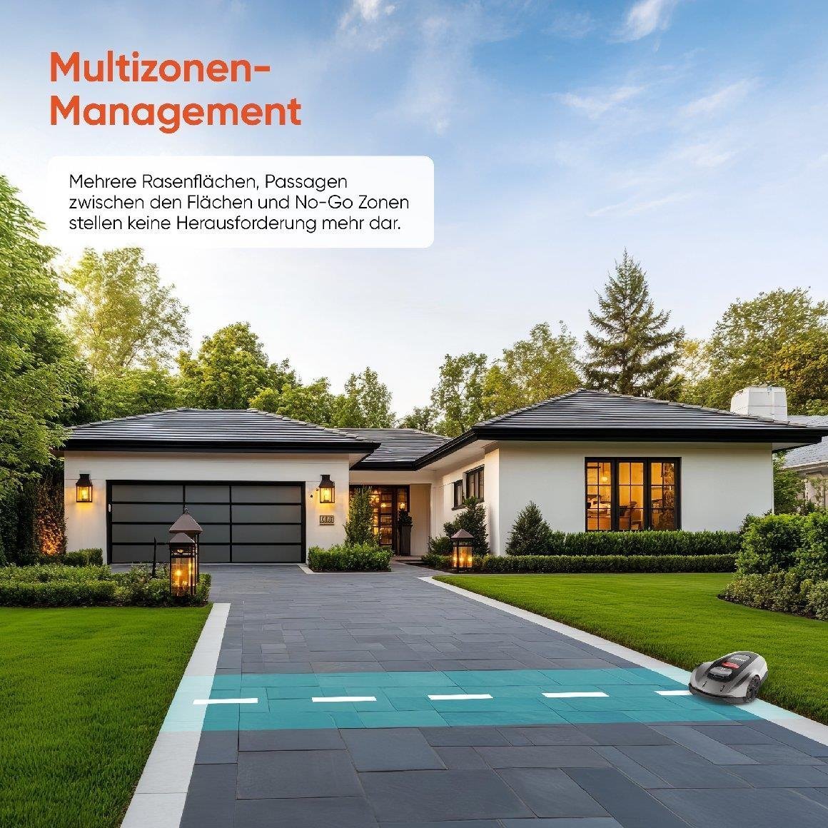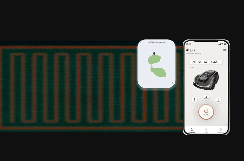 Über das eingebaute GPS-Modul erkennt das Gerät, welche Flächen schon gemäht wurden und fährt dann gezielt noch ungemähte Flächen an.