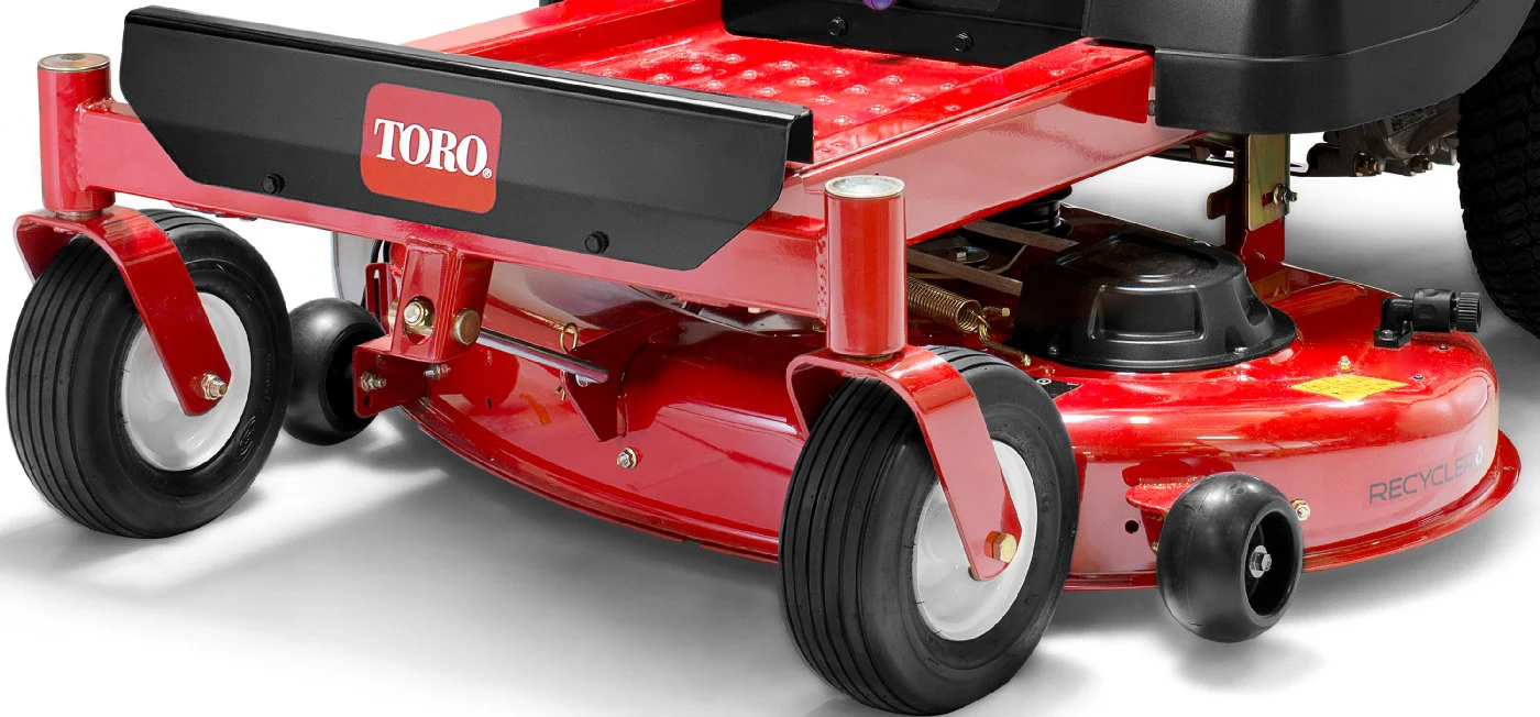 Die Führungsräder am Mähwerk verhindern das Aufsetzen der Messer bei unebenem Gelände.